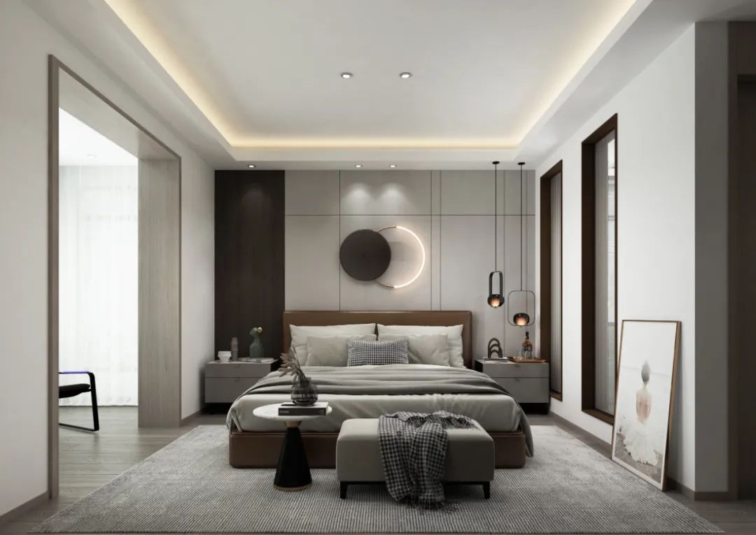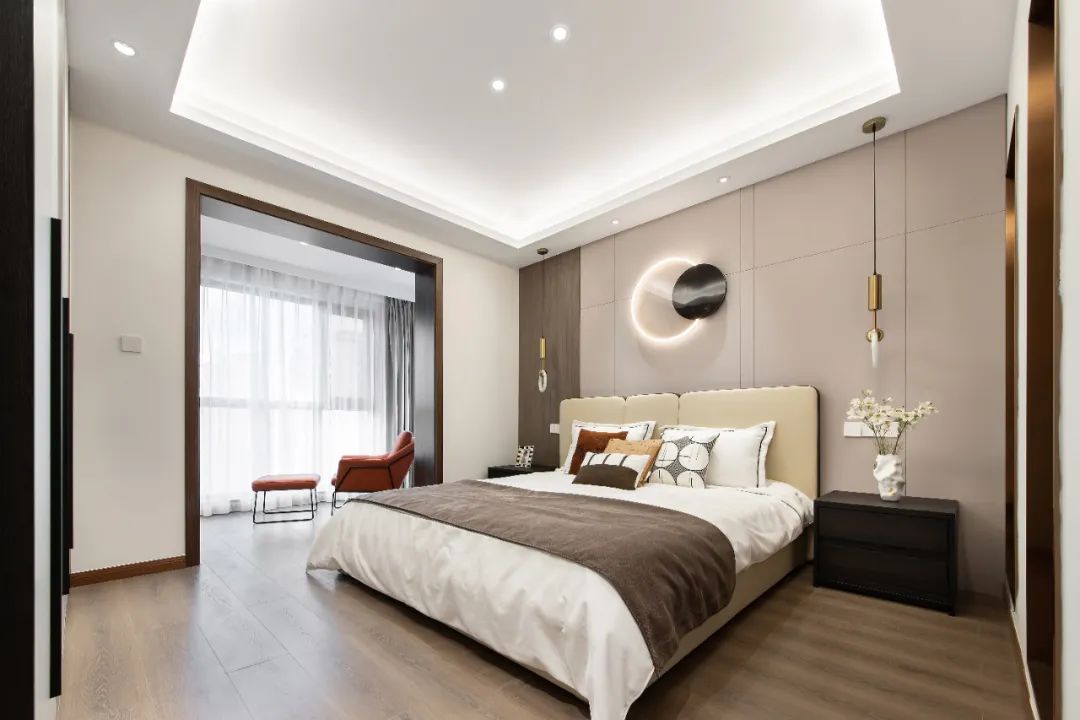 主臥用木紋、白、灰三色將整體空間串聯(lián)起來,保持全屋的統(tǒng)一基調;分色墻組合燈線,增添空間層次感的同時,又給了臥室獨有的小心機。